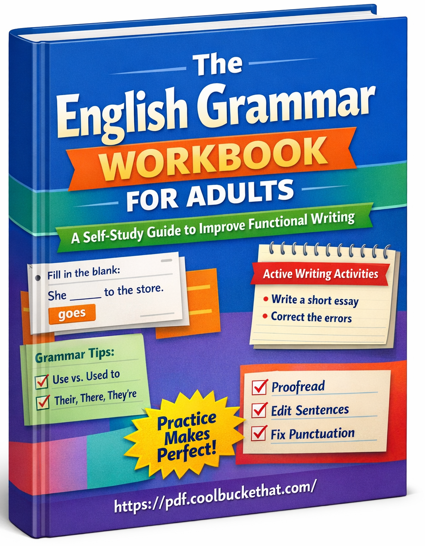The English Grammar Workbook for Adults – A Self-Study Guide to Improve Functional Writing is created for adult learners who want clear, practical, and usable grammar skills. Many adults return to English learning with a specific goal. They want to write better emails, reports, applications, or everyday messages. They are not looking for complex theory. They want grammar that works in real life.